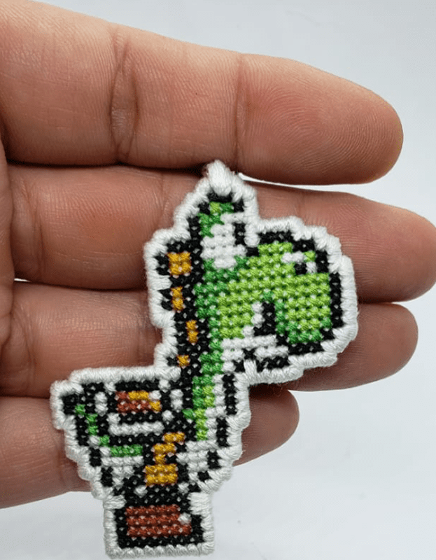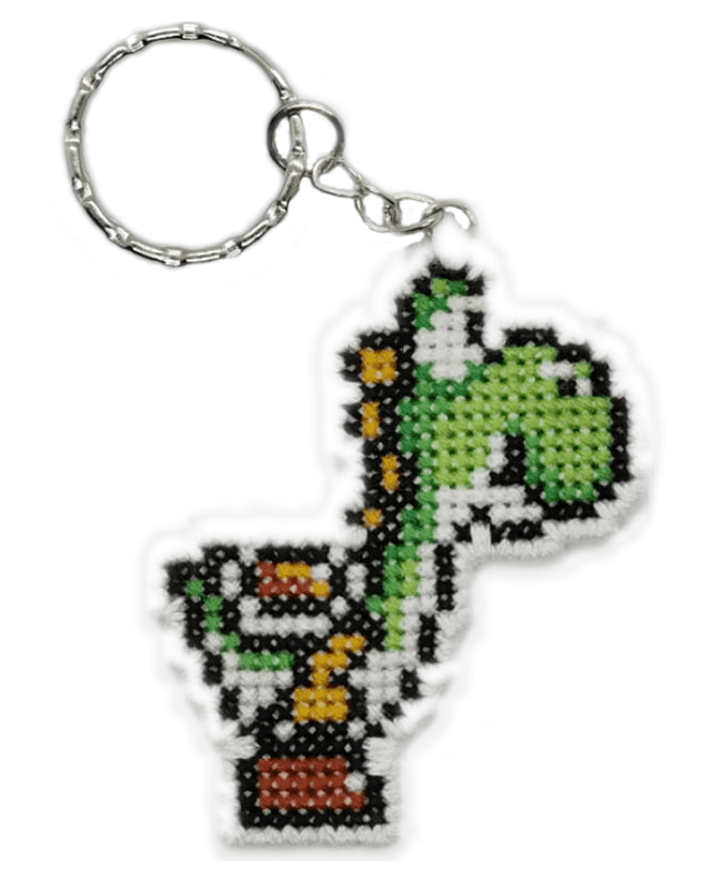 El llavero fue realizado utilizando tela Aida e hilo DMC, junto con alambre y una cadena de metal, y tardó aproximadamente 1 semana para ser construido. Pixel por pixel.