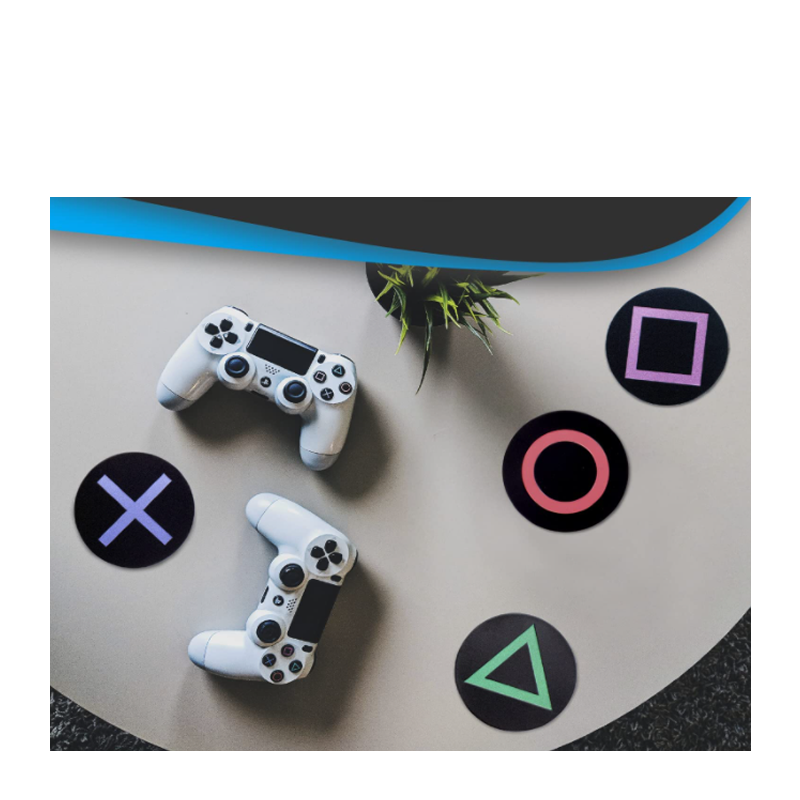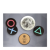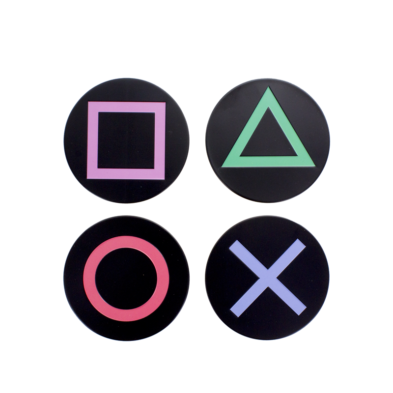 Los posavasos de metal (con base de corcho) son inspirados en una de las consolas más famosas de todos los tiempos, exhibiendo los símbolos de los 4 botones icónicos del control de Playstation.
